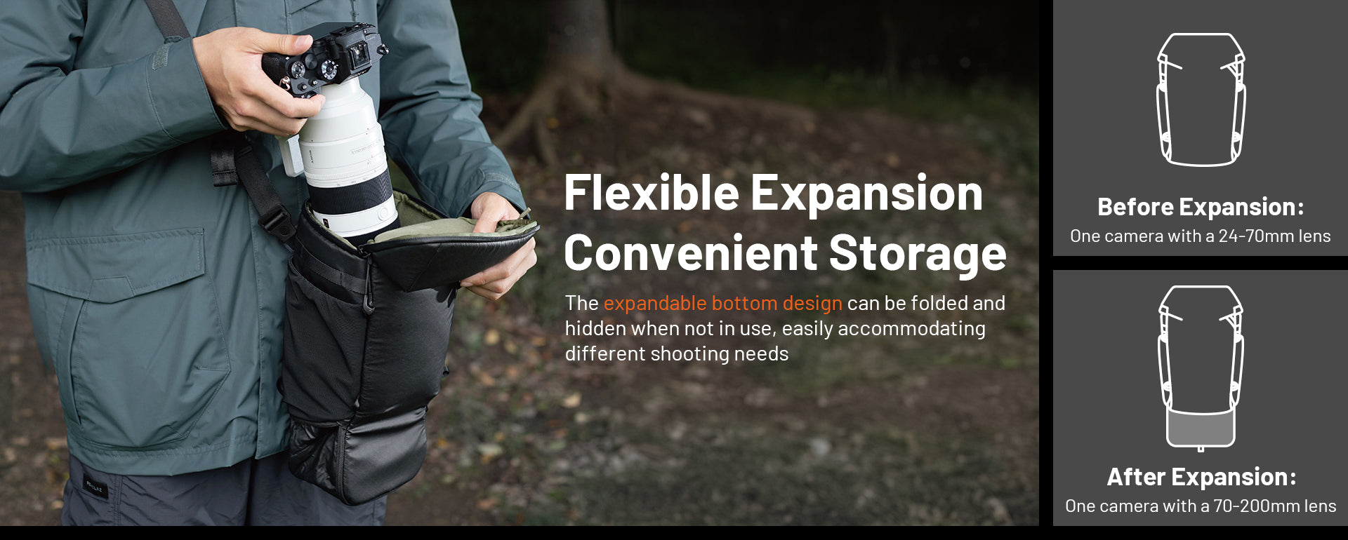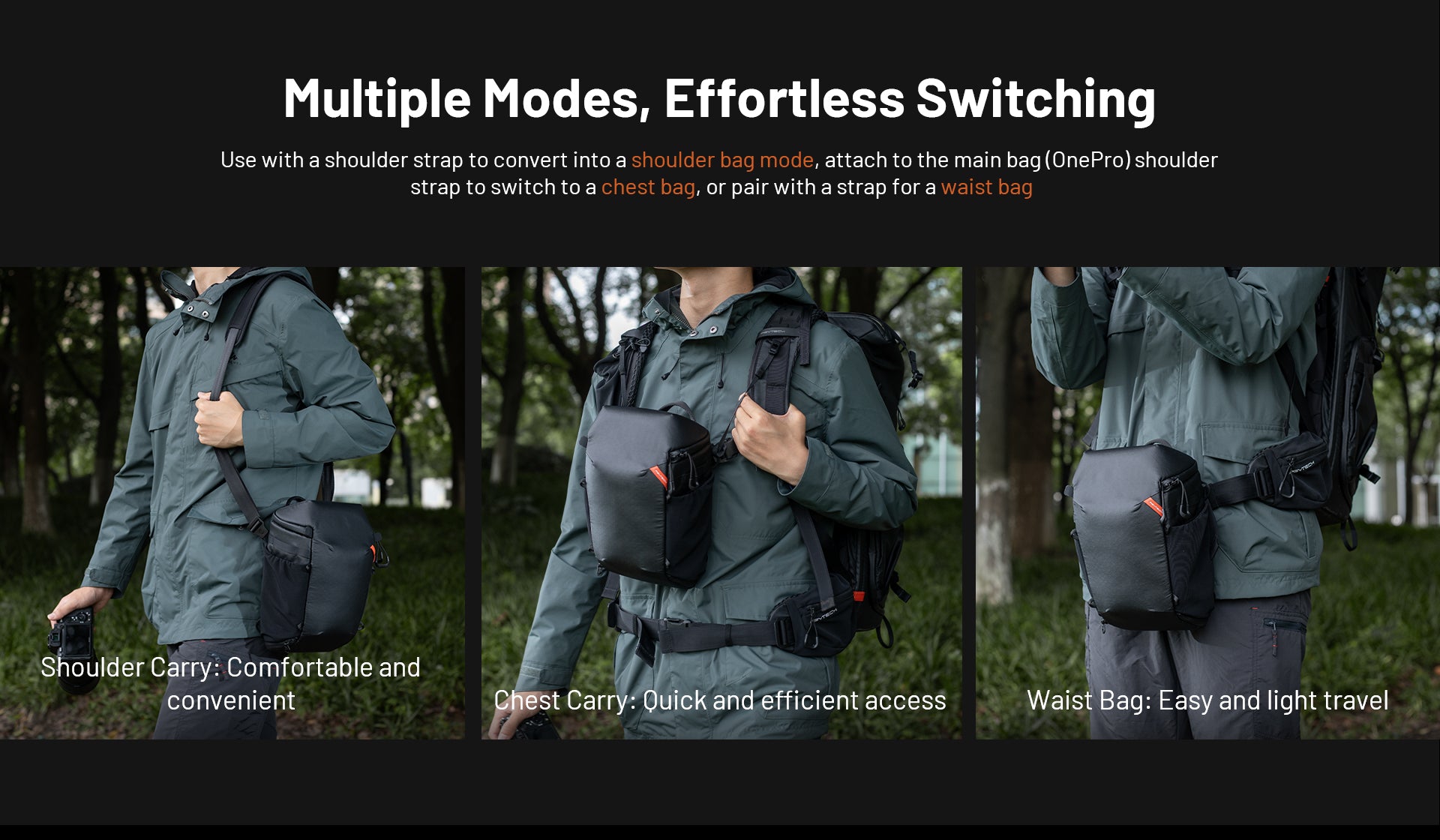 Brauchte zum Wandern eine Kameratasche, die ich an den vorderen Riemen befestigen konnte. Diese Tasche ist perfekt, sie passt zu meinem OM1 mit 100-400, ohne dass sie verlängert werden muss. Die Befestigungspunkte sind an der perfekten Stelle, sodass es nicht wie bei den Kamerataschen, die ich in der Vergangenheit hatte, auf und ab hüpft. Normalerweise bleibe ich bei Wandrd, aber für 30 $ weniger und mit mehr Funktionen ist die Pgytech eine bessere Tasche.