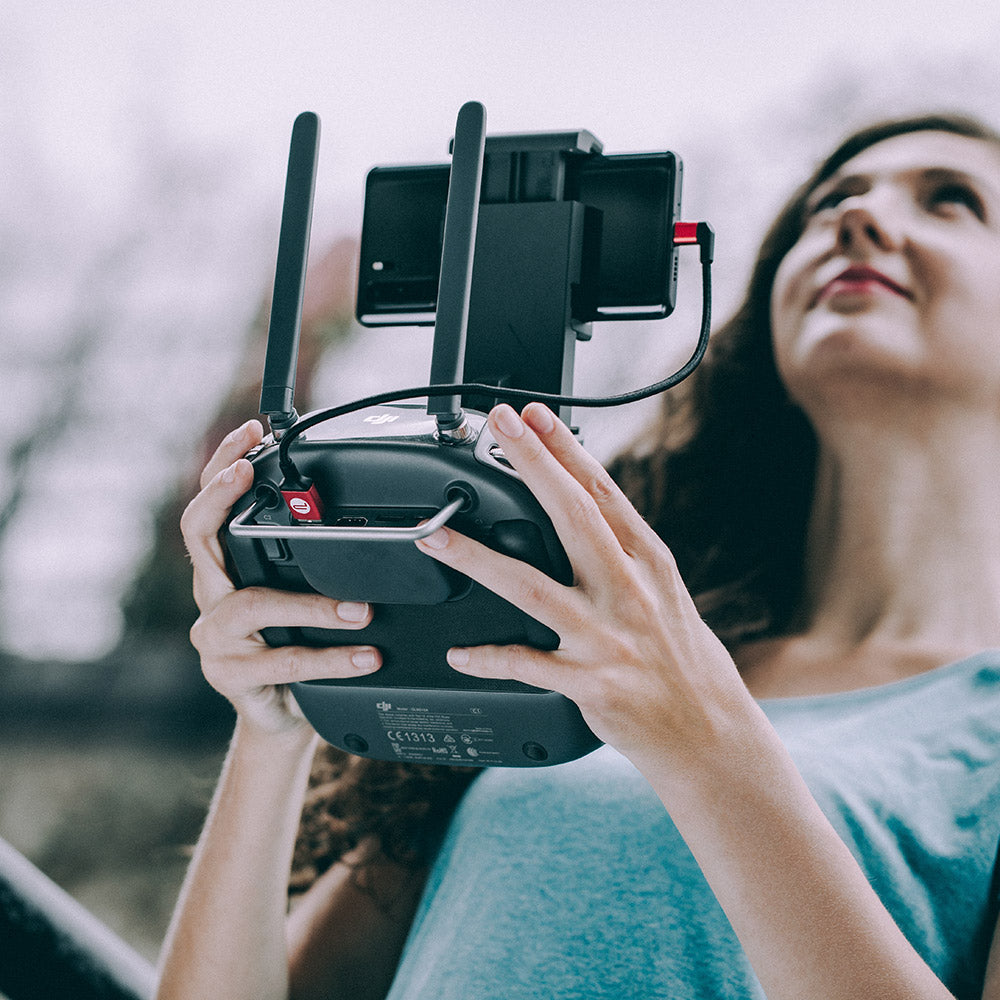 Zwischen dem Fernbediener einer Drohne und Ihrem Mobiltelefon mit einem Typ-C-Anschluss.