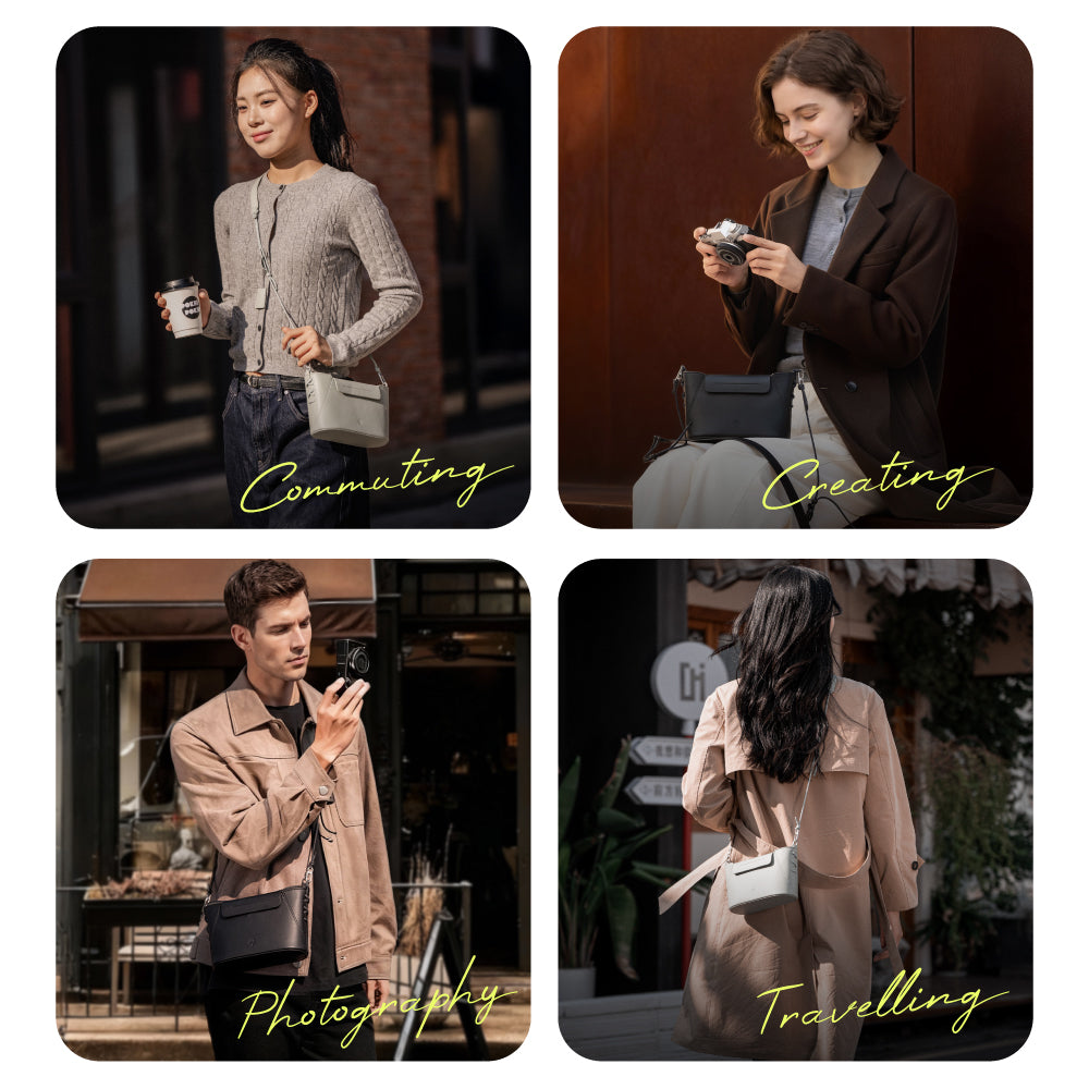 1.Classic retro design with a sense of style.2.Horizontal layout for storing a mobile photography grip, Osmo Pocket, or a compact camera like the Fuji X100. The bag features the adjustable divider for organized and efficient storage. In addition to the main compartment, there's an external pocket for organizing everyday items such as a power bank and earphones.3.Magnetic quick-open design for fast camera access.4.Equipped with TagPort, it supports DIY brand badges and is compatible with Crocs accessories.5.Includes a cleaning accessory to keep the lens clean during use.