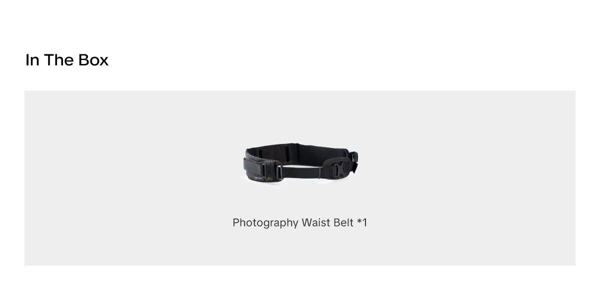 1.Extra Padding, Total Comfort. The waist belt features a padded section behind the front buckle that effectively eliminates pressure points, preventing the hard buckle from pressing directly against your abdomen.2.The waist belt is equipped with multiple attachment points, allowing you to mount quick-release camera clips, lens pouches, tripod or accessory bags, and more.3.The right side features a camera tether strap to temporarily keep the camera securely in place, preventing unwanted swinging while you're on the move.4.The waist belt can be worn on its own, or attached to a backpack's built-in interfaces for use as a backpack waist belt.5.Crafted from durable high-strength polyester fabric, it resists abrasions, tears, and deformation, ensuring secure, stable support for your gear.
