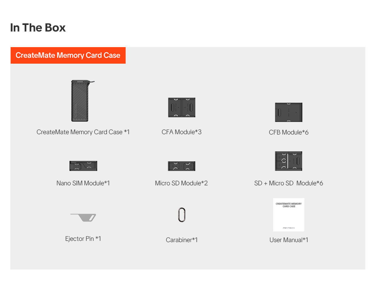 1. Ample capacity with multiple card slots that can accommodate Micro SD, SD, CFA, CFB/XQD, and Nano SIM cards. Includes a convenient ejector pin for effortless card removal and swapping.2. Modular design for maximum use of internal storage space.3. Unibody aluminum alloy shell for strength and durabilityïŒSealed structure design offering IP54-rated dust and water splash protectionïŒSilicone protective case for effective shock absorption and drop protection.4. Convenient carabiner clip is included for quick attachment to a backpack, bag or belt loop.
