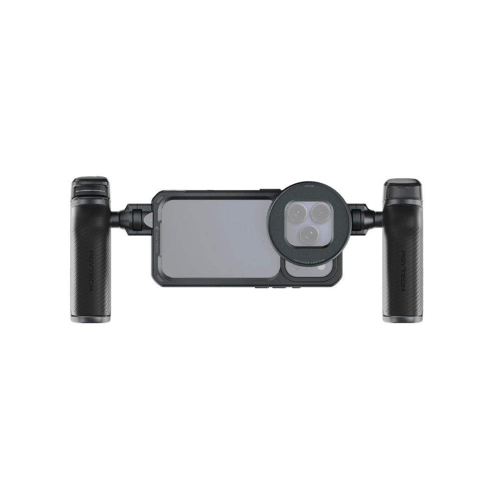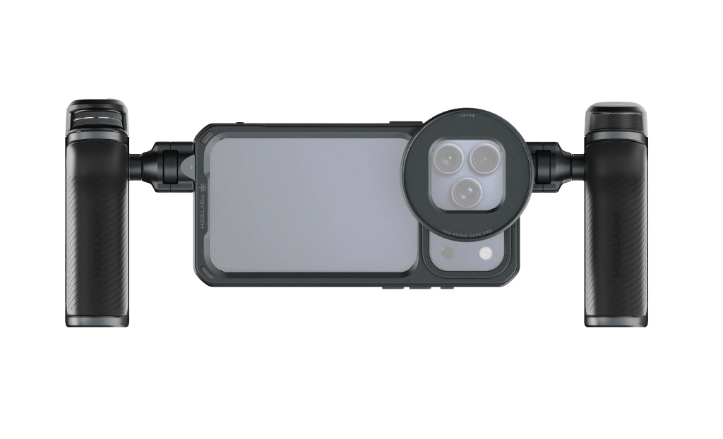 1. The PGYTECH ProShot Phone Video Cage Kit Professional Mobile Imaging Ecosystem is tailored for iPhone 17 Pro Series.2. The dual-hand grip design ensures well-balanced weight distribution for exceptional stability, enabling smooth, cinematic camera movements. The ergonomic ProShot Quick-Release Grip contours naturally to your hand, while the Bluetooth Remote Control's 10 degree tilt perfectly aligns with the curve of your index finger.3. The Right Grip's included Bluetooth Remote Control Module seamlessly integrates with the PGYTECH PhotoVideo Creative App, delivering precise,camera-level control.4. Both Grips come with a Standard Module that includes an internal storage compartment for cables. This module can be swapped out for a ProShot Battery Module or a ProShot PSSD Module, as needed.5. The Phone Cage is equipped with expansion ports, allowing you to easily attach the ProShot Quick-Release Grip, a 1/4"-20 socket adapter, and a cold shoe mount. The Grips also offer a cold shoe mount that can hold accessories such as fill lights or microphones when the top Bluetooth Remote Control Module or Standard Cover Module is removed.